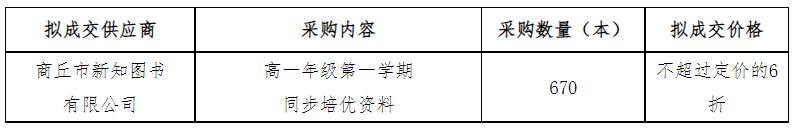 商丘市第一高级中学2022-23学年高一年级第一学期学生培优用书采购项目,拟采用单一来源方式采购,现公示如下:
