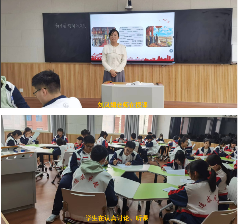 第二节课是高二年级刘凤娟老师展示的是《新中国初期的外交》。这节课采用问题探究法教学,积极鼓励学生自主学习,培养独立思考能力,充分发挥小组团队的力量,合作攻克重难点问题,同学们都沉浸在课堂当中,充分贯彻了新课程改革,以学生为主体,教师为主导的理念。